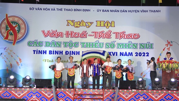 Ban tổ chức trao cờ lưu niệm, tặng hoa cho đại diện 6 đoàn tham gia Ngày hội VHTT các dân tộc thiểu số miền núi tỉnh Bình Định lần thứ XVI năm 2022