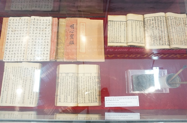 Các tư liệu, hiện vật trưng bày tái hiện các di tích với quá trình hình thành, phát triển, nỗ lực tu bổ, tôn tạo phục hồi di tích gốc, đặc biệt là những câu chuyện kể xúc động, khắc họa cuộc sống sinh hoạt, học tập, lao động của Chủ tịch Hồ Chí Minh và gia đình khi ở Huế. Trong ảnh là các hiện vật về tài liệu và dụng cụ học tập, dạy học của cụ Nguyễn Sinh Sắc, thân sinh Chủ tịch Hồ Chí Minh, lúc ông vào kinh đô Huế.