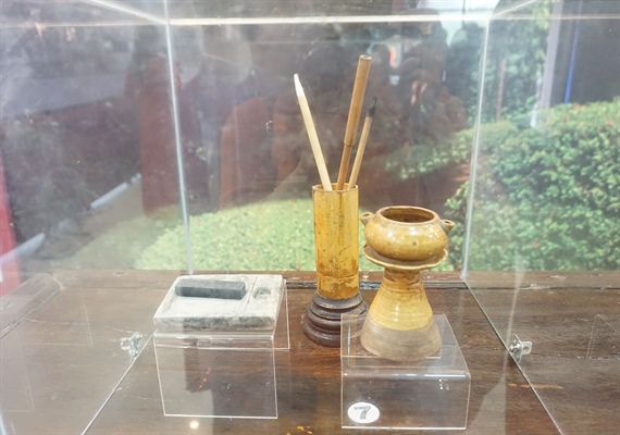 Nghiên mực, đèn dầu lạc, bút lông dùng cho việc học tập khi gia đình Bác Hồ ở căn nhà đường Mai Thúc Loan, Huế.